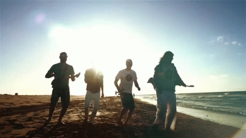 A group of friends dances joyfully on a beach at sunset, with one playing a ukulele, enjoying life by the ocean.
