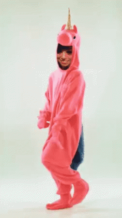 A person in a vibrant pink unicorn pajama costume and sunglasses dances joyfully, moving their arms and legs.