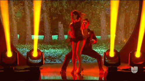 Lindsay Casinelli performs a passionate tango dance on stage, illuminated by bright lights.