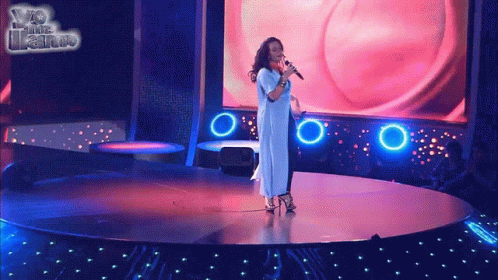 Woman performs a lively dance on stage during the 'Yo Me Llamo' show, holding a microphone.