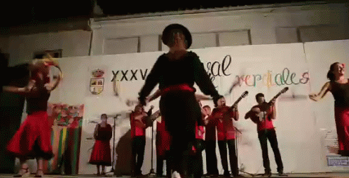 A group performs a traditional Verdiales dance on stage in Málaga, Spain, with musicians playing guitars.