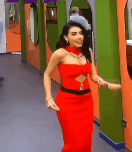 Karime Pindter dances the Matrioshka in a stunning red dress, smiling brightly in a colorful hallway.