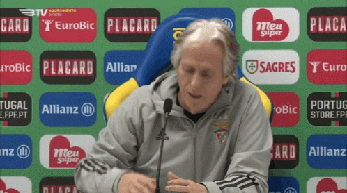 Jorge Jesus speaks at a press conference, gesturing while addressing the audience with sponsor logos in the background.