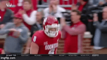 Baker Mayfield, wearing his Sooners jersey, celebrates on the football field.