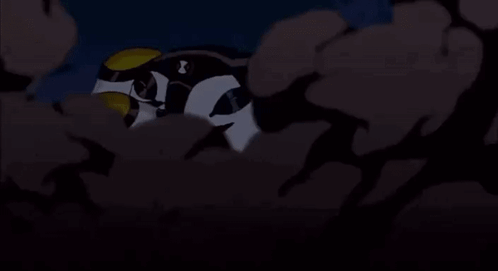 Ben 10's alien form Cannonbolt emerges from the ground, roaring and showing its sharp teeth.
