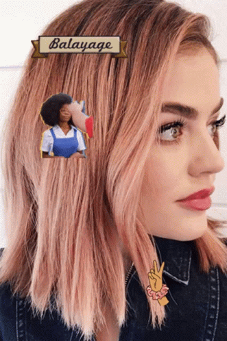 A woman showcases her beautiful balayage hair, blending brown roots with pinkish-blonde ends.