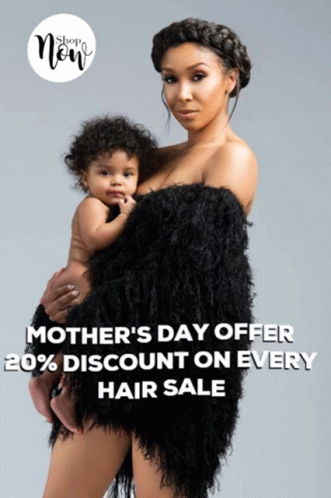 Mother's Day offer: 20% discount on hair sales, featuring a woman holding a baby.