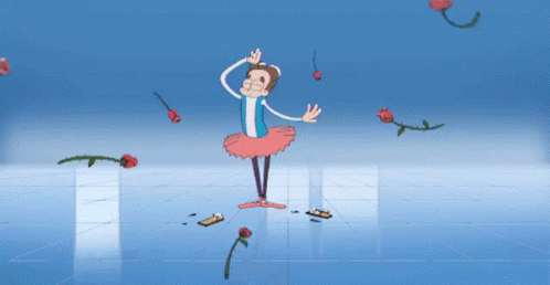 Animated character Bob performs ballet in a pink tutu as roses fall around him.