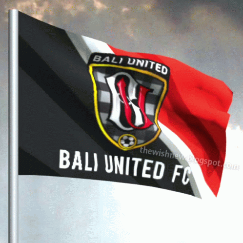 The official flag of Bali United FC, an Indonesian football club, waving proudly against a cloudy sky.
