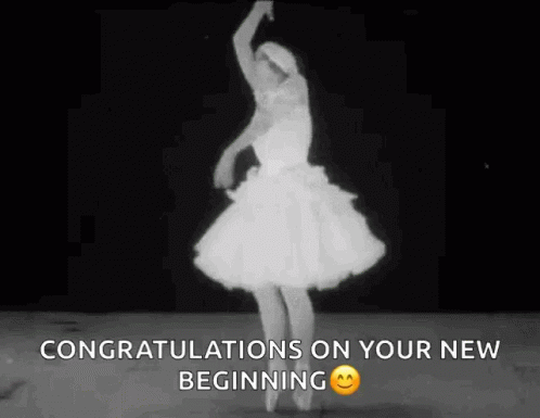 A graceful ballerina performs a ballet dance in a white tutu, accompanied by a congratulatory message for a new beginning.