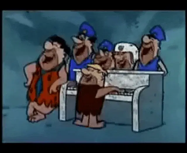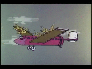 Balthazar Pierre A Feu and Fred Caillou fly a cartoon airplane powered by pterodactyls in a cloudy sky.