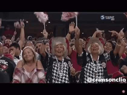 Alabama football fans in houndstooth cheer and wave flags at a game, showing their 'Roll Tide' spirit.