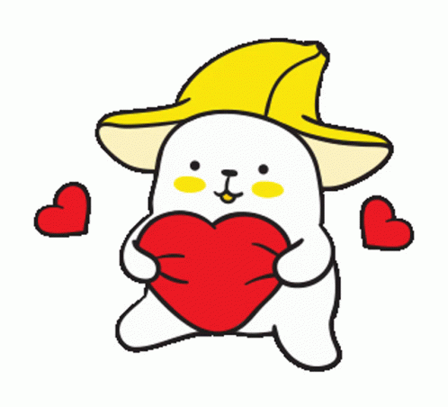 Cute cartoon character Bana Bana Nana wearing a yellow banana hat and holding a red heart.