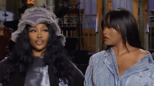Two women, possibly Zach and Campbell, show expressive reactions in a studio setting.