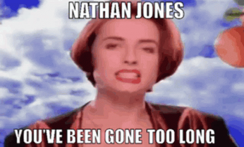 Bananarama's "Nathan Jones" music video clips with "NATHAN JONES YOU'VE BEEN GONE TOO LONG" meme text.