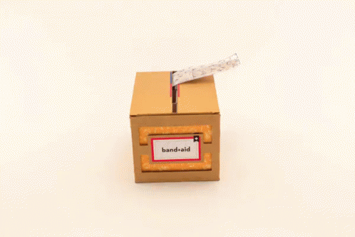 A creative DIY band-aid dispenser made from a cardboard box is demonstrated, applying a band-aid to a small cut.