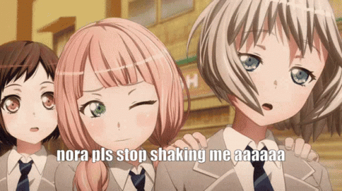 Moca Aoba and Himari Euhara from Bandori with the caption 'nora pls stop shaking me aaaaa'.