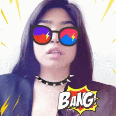 Nina Saurus, wearing cool sunglasses and a spiked choker, sticks out her tongue with a 'BANG!' graphic.
