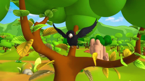 A black crow perches on a tree branch, then takes flight in a vibrant cartoon forest scene.
