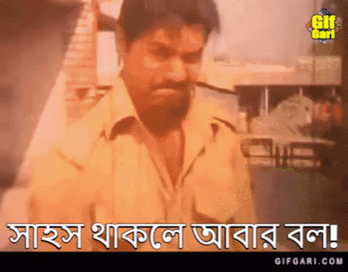 An angry man from a Bangla cinema scene challenges someone, saying 'If you have courage, say it again!'