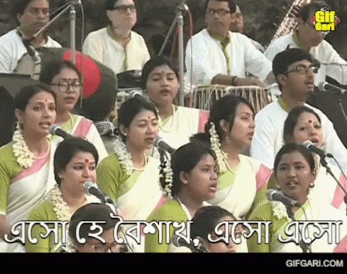 A vibrant group performs 'Esho He Boishakh' to celebrate Pohela Boishakh, the Bengali New Year, with traditional attire.