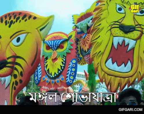 Vibrant traditional masks and figures from the Mongol Shobhajatra parade celebrating Bengali New Year.