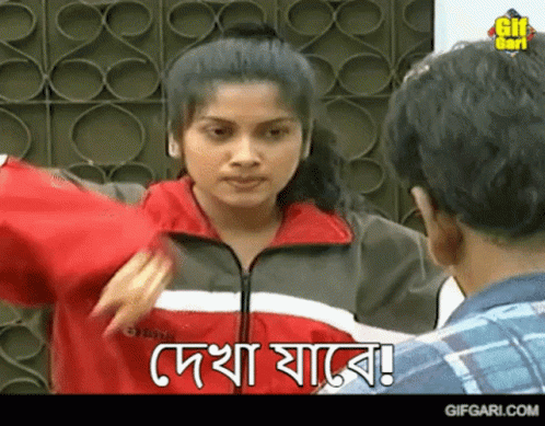 Woman in red jacket says 'Dekha Jabe!' in a dramatic Bangla Natok scene.