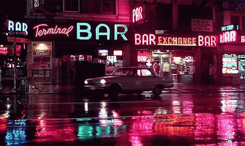 A car drives past the neon-lit 'Terminal Bar' on a rainy city street at night, reminiscent of Altered Carbon.