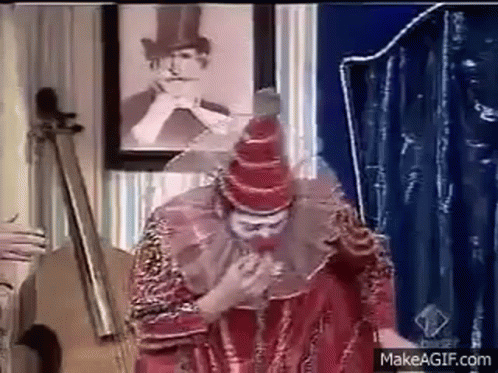 Baraldi, the clown, performs a comedic coughing act, amusing his companion on stage.