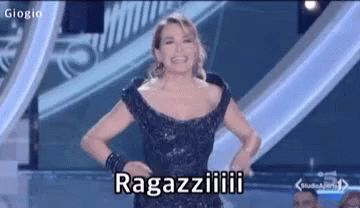 Barbara D'Urso energetically greets the audience with 'Ragazziiii!' on stage, hands on hips, wearing a sparkling dress.