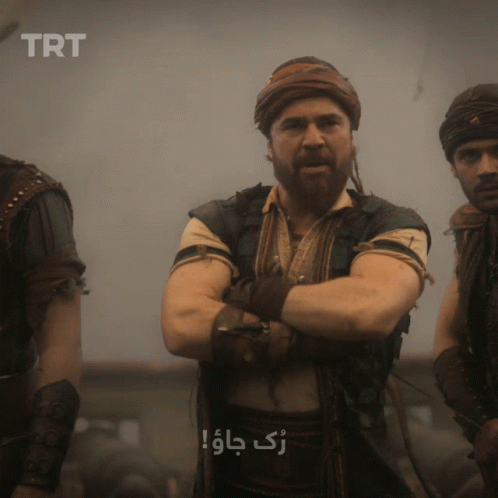 Ertugrul, a fierce warrior from a Turkish drama, shouts intensely with arms crossed, featured with the TRT logo.