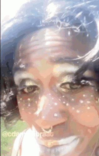 Barbieeechanel showcases an exaggerated makeup look with glitter, purple eyeshadow, and a wide smile.
