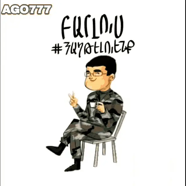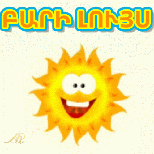 A cheerful cartoon sun with a big smile and a waving hand, wishing 'Good Morning' in Armenian.