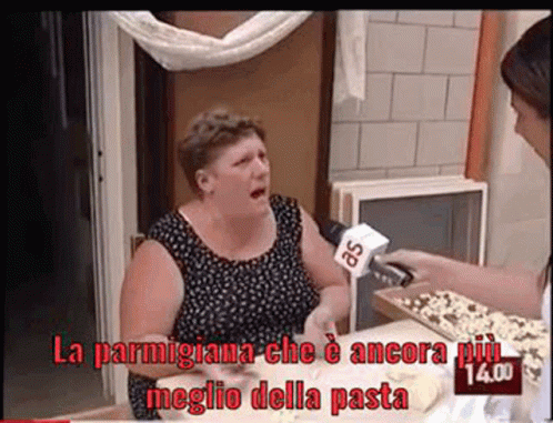 A woman in Bari discusses parmigiana, claiming it's even better than pasta.