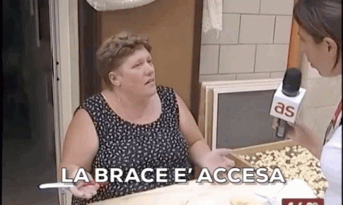 A woman passionately speaks into a microphone during an interview in Bari Vecchia, with the phrase "La Brace è Accesa" displayed.
