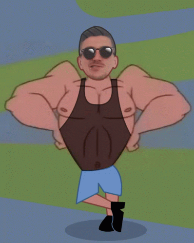 Barnabravo Johnny's head on a muscular cartoon body, flexing with sunglasses.