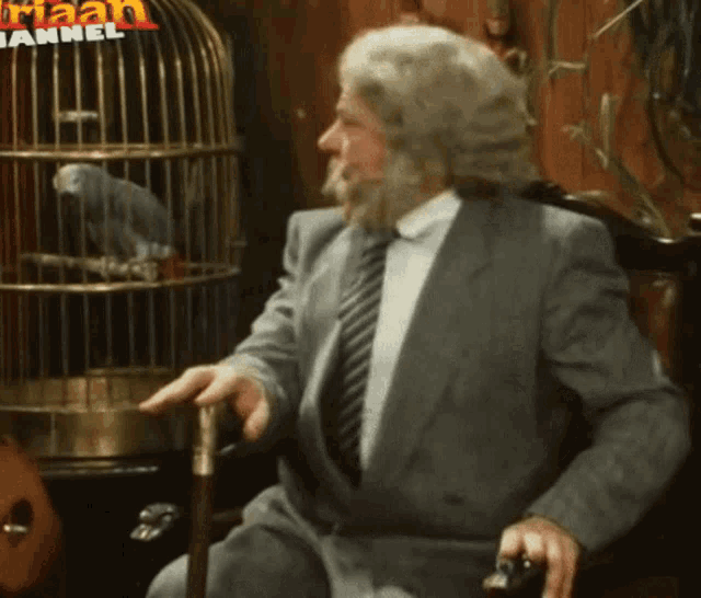 Baron Van Neemweggen reacts with his walking stick, ready to fight, while a parrot watches from its cage.