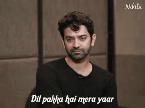 Barun Sobti smiles, wearing a black shirt, with the Hindi phrase 'Dil Pakka Hai Mera Yaar' (My heart is strong, friend).