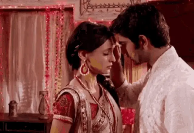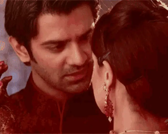 Barun Sobti and Sanaya Irani share a romantic dance, embracing closely in a dimly lit setting.