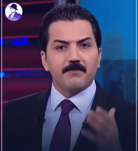 Man in a suit and tie with a mustache makes a passionate gesture, with Kurdish captions saying 'Enough! It was bad'.