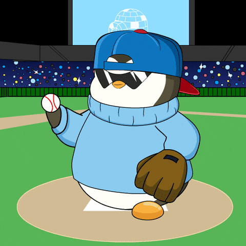 A cool penguin pitches a baseball, another penguin bats it for a homerun in a stadium.