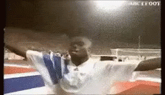 French footballer Basile Boli celebrates on the field, raising his arms and acknowledging the crowd.