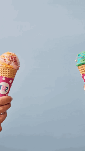Two hands hold colorful Baskin Robbins ice cream cones, a perfect sweet treat.