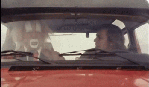 Bassie the clown bumps his head in a red car as the driver brakes suddenly, causing a humorous moment.