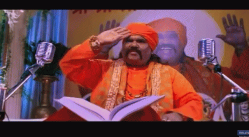 Bata Bhai, wearing an orange turban and robe, delivers a passionate discourse from behind a podium.