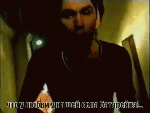 A man from the band Zhuki sings 'Batareyka' about love and a broken heart in a dark hallway.