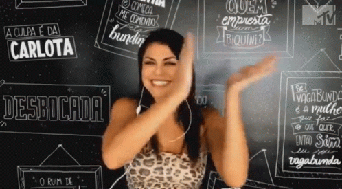 Bruna Louise claps enthusiastically in front of a chalkboard with Portuguese phrases, celebrating at Miaw2020.