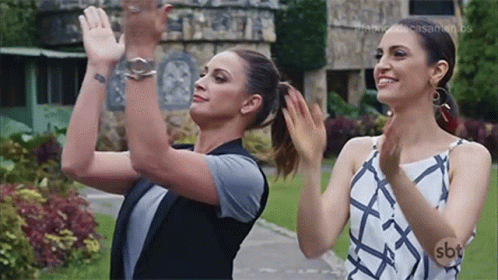 Catherynne and Guilherme clapping enthusiastically outdoors, likely from the Brazilian TV show Fábrica de Casamentos.