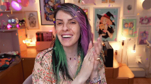Karen Bachini joyfully clapping as colorful confetti falls around her, celebrating a happy moment.