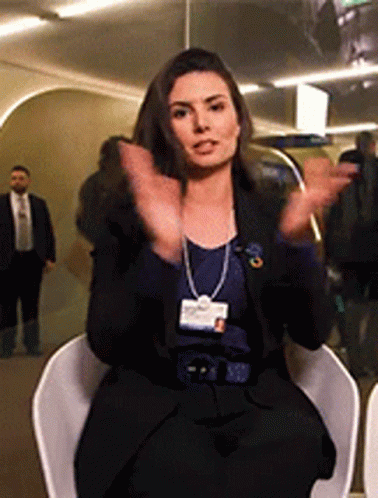 Nathalia Arcuri clapping her hands, wearing a name tag at an event.